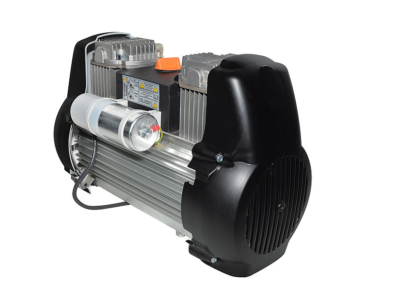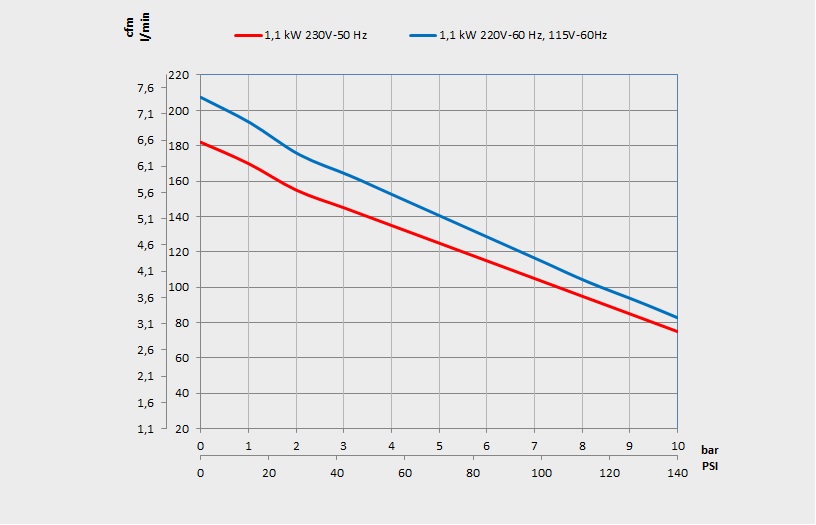 Compressore a secco bicilindrico 230V-50Hz, 1.380 giri, portata 135 l/min@5 bar, assorbimento massimo 6,2 A . Solo 64 dB/1m di rumorosità!!